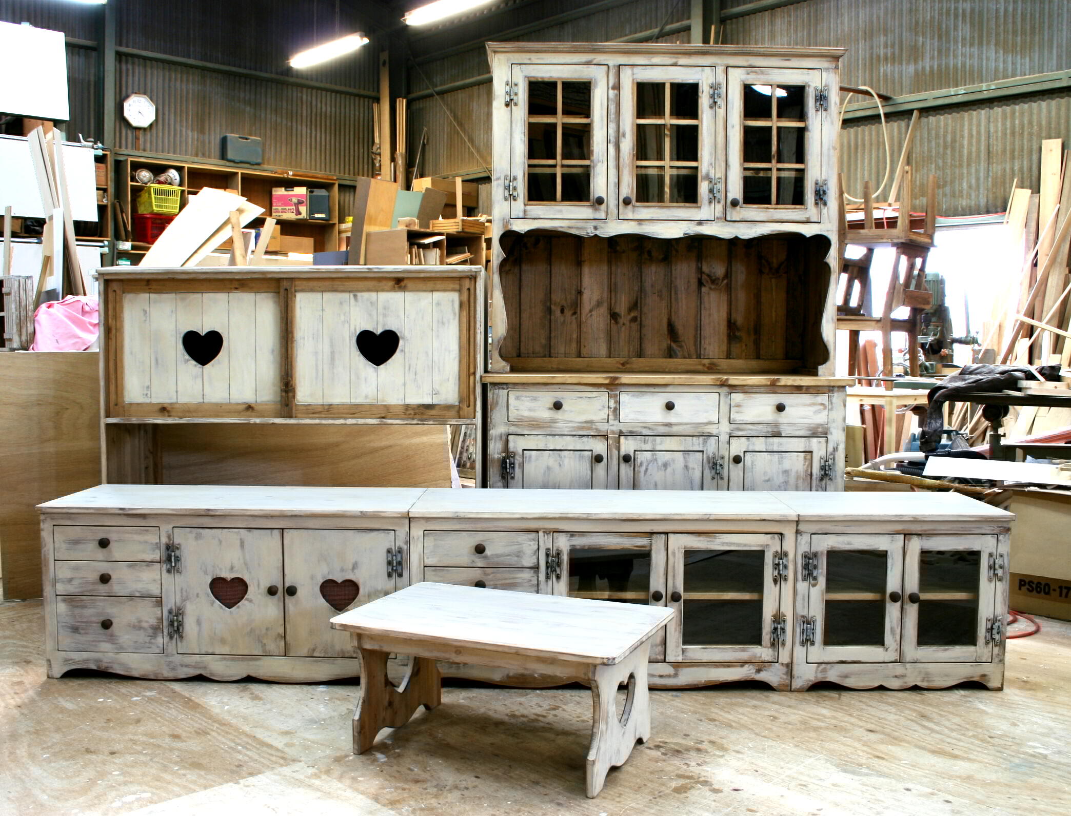 こちらのローボード(ホワイトアンティーク仕上げ)以外に、アンティークカップボード(ホワイト、幅120cm 3ドアタイプ)、引き戸式キッチン収納棚、コーヒーテーブルを一緒にオーダーいただきました。